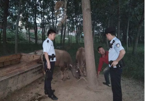 为了帮水牛回家,郎先生只好报警求助。接警后,王家坝派出所民警来到郎先生家中,发现两头水牛是成年牛犊,市价约值两三万元钱。