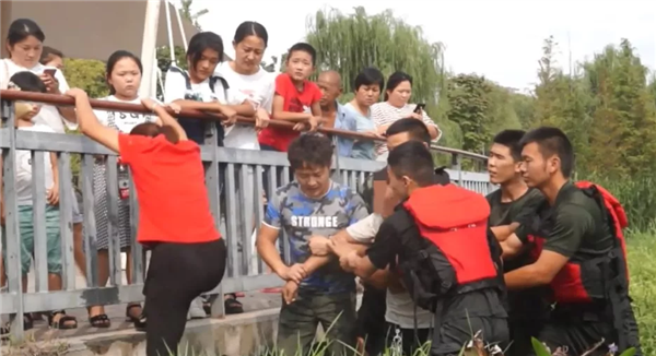 为了迅速控制女子,防止发生意外,消防员迅速蹚水到女子的位置,一把死死将女子抱住。最终在三名消防员的合力营救下,女子被强行控制带到了岸边。