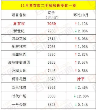 2、9个小区,均价最高的是万和花园小区10054元/㎡,最低香怡小区4562元/㎡。其中,5小区房价出现下跌,下降幅度最大的是家和小区4929元/㎡,环比10月6494元/㎡,下跌24.1%!
