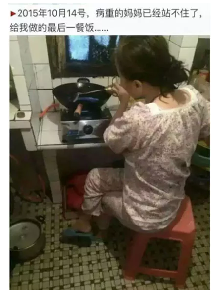微博上,网友发了这样一张图片:即使病倒站不住了,重病的妈妈仍坚持要给孩子做最后一餐饭。
