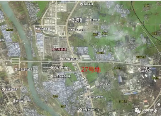 [2017]-27地块位于颍东路南侧、阜涡路西侧,北边正对着临沂商城,西侧是水岸明珠小区,临近阜阳第二十二中学,周边二手房价8000+