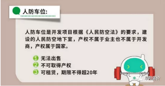 大家好,阜阳目前出售所有车位均为无产权车位!也就是大家常说的“人防车位”!人防车位不得对外出售,但可以对外出租。租期最长不得超过20年,单次租期不得超过3年!出租费用于日常维护费用。且该费用由国家或政府部门统一收取,开发企业及物业无权收费。或由物业部门代为收取,再交由相关部门。