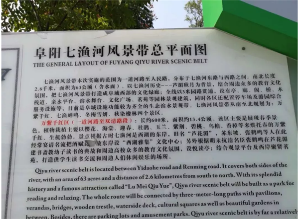 9月24日上午,有网友反映,七渔河风景带总平面图标牌出现多处错误。市旅游局值班负责人第一时间关注此事。七渔河风景带的标牌并非市旅游部门负责,但事关大美阜阳形象,市旅游局派人实地查看。第一站到西湖大道与