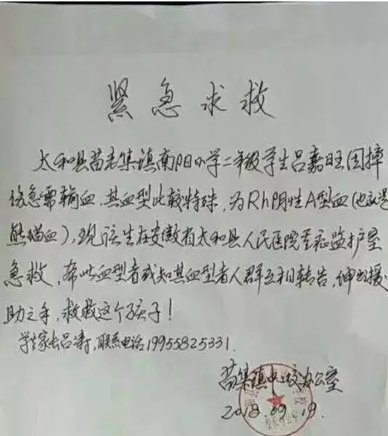急!急!快救救这个可怜的孩子!太和县苗老集镇南阳小学二年级学生吕嘉旺因摔伤急需输血,其血型比较特殊,为Rh阴性A型血(也就是熊猫血),现该学生在太和县人民医院重症监护室急救,希望此血型者或知其血型者人