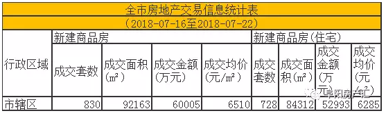 7月24日,据阜阳市房地产管理局最新发布信息,公布了7月16日-7月22日(7月第三周)阜阳市房地产市场的交易状况,阜阳市辖区商品房销售共830套,销售总面积为92163㎡,销售均价为6510元/㎡,